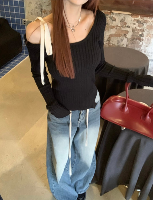 Off- Shoulder Long Sleeve Ribbon Knitwear